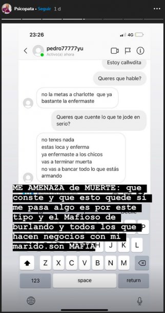 Ante esto, la mediática enfatiza las ciertas frases y arremata contra el abogado del ex futbolista: “Me amenaza de muerte: que conste y que esto quede si me pasa algo es por este tipo y el mafioso de (Fernando) Burlando y todos los que hacen negocios con mi marido. Son mafia”.