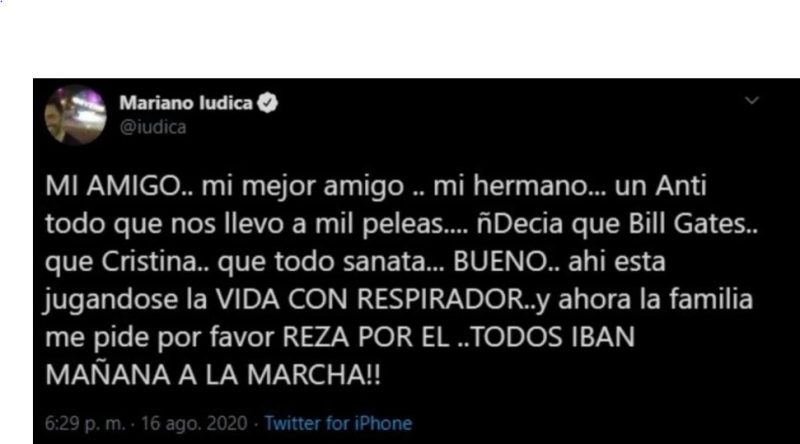 “Mi amigo, mi mejor amigo, mi hermano, un anti todo que nos llevó a mil peleas decía que Bill Gates, que Cristina, que todo sanata. Bueno, ahí está, jugándose la vida con respirador y ahora la familia me pide ‘por favor, rezá por él’. Todos iban mañana a la marcha“, escribió el conductor de Polémica en el bar en su cuenta de Twitter.