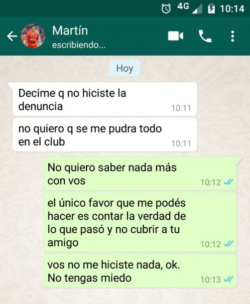 Una de las pruebas que tiene la querella para denunciarlos son los chats de Whatsapp que ambos jugadores mantuvieron con la víctima horas después de la violación. Hay que recordar, que existen aplicaciones que pueden modificar los chats de whatsapp de cualquier momento de la historia, por lo que en muchas partes del mundo ya no se los toma como una prueba valedera.