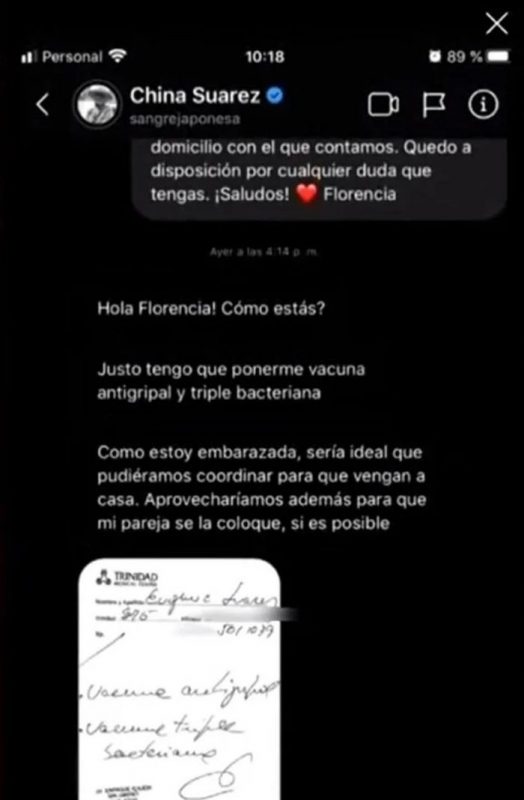 Según mostraron en el programa “Confrontados”, Suárez solicitó a una clínica que un médico que fuera hasta el country en el que pasa la cuarentena para aplicarle la vacuna antigripal y la triple bacteriana.