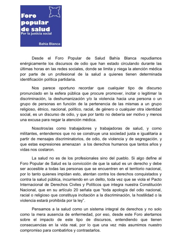 Más repudios al médico de Bahía que anunció que no atenderá pacientes peronistas