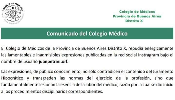 El Foro Popular de Salud por la Justicia Social y el Colegio de Médicos de la Provincia de Buenos Aires Distrito X repudiaron este jueves las expresiones “lamentables e inadmisibles” del médico Juan Petrini, que en las redes sociales anunció que “desde el 1 de agosto” no atenderá a “pacientes que simpaticen con el peronismo”.