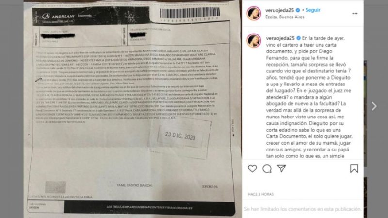 “En la tarde de ayer, vino el cartero a traer una carta documento, y pide por Diego Fernando, para que le firme la recepción, tamaña sorpresa se llevó cuando vio que el destinatario tenía 7 años”, relató este martes 29 de diciembre la expareja del Diez, atónita por lo que vivió.