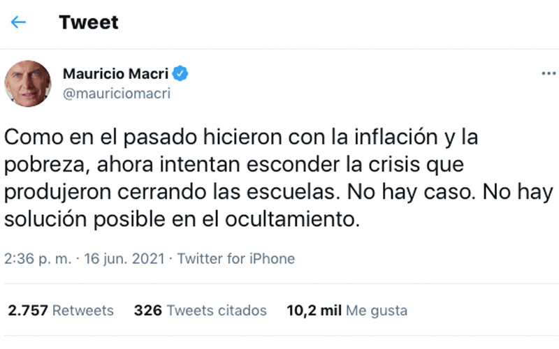 En medio del conflicto por la presencialidad de las clases alrededor del país, el exmandatario compartió una polémica publicación en Twitter: “Como en el pasado hicieron con la inflación y la pobreza, ahora intentan esconder la crisis que produjeron cerrando las escuelas. No hay caso. No hay solución posible en el ocultamiento”.