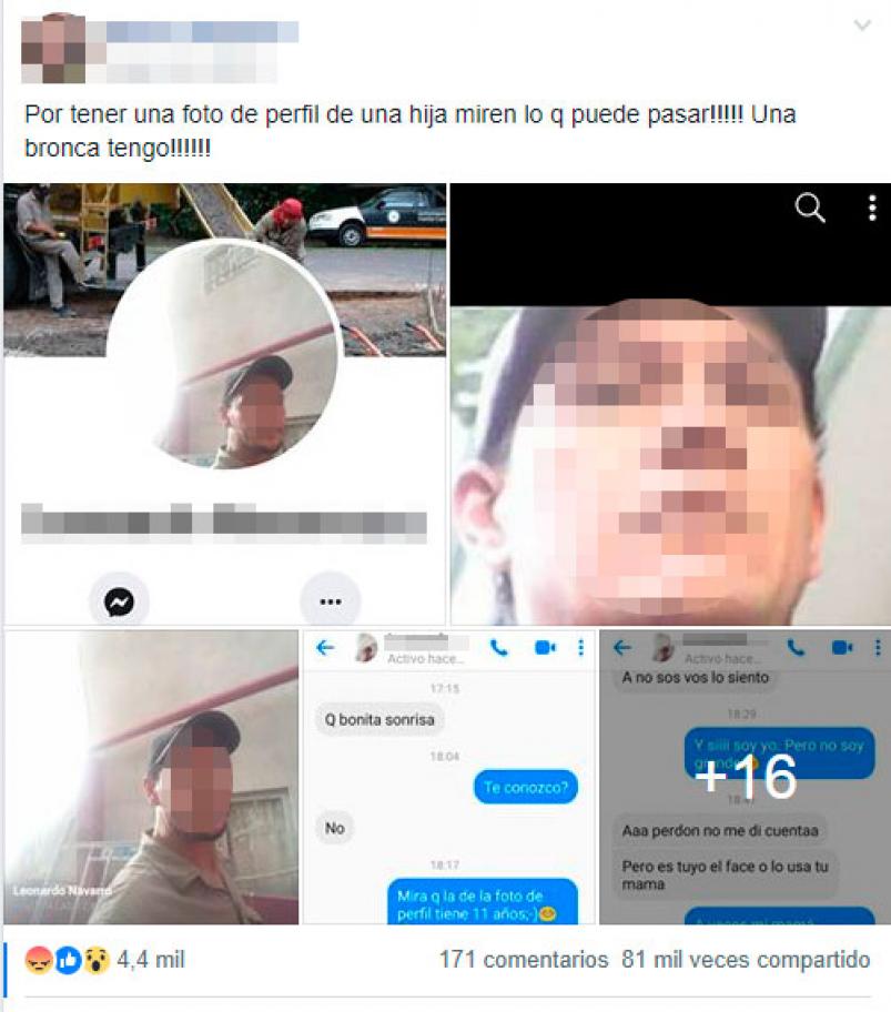 Tras ese intercambio de mensajes, la mujer quedó horrorizada y decidió escrachar al acosador. “Por tener una foto de perfil de una hija, miren lo que puede pasar”, denunció enfurecida.