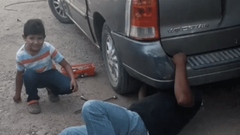 Mecánico le pide a su hijito que le pase el gato y mirá lo que sucede