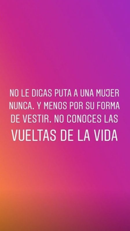 Por último, tras despejar los rumores sobre su situación sentimental y aclarar que no está de novia (con un emoji de una carita enojada incluido), la cantante cerró: “No le digas pu… a una mujer nunca. Y menos por su forma de vestir. No conocés las vueltas de la vida“.