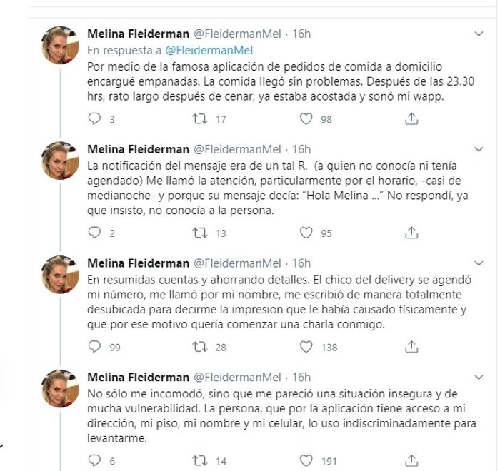 Melina Fleiderman denunció un caso de acoso con un delivery que trabaja para una conocida aplicación desde su cuenta de Twitter.