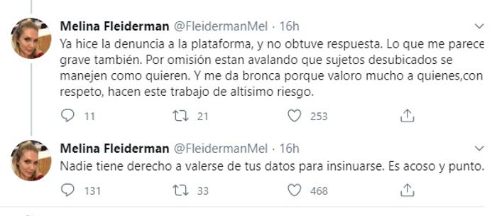 “Nadie tiene derecho a valerse de tus datos para insinuarse. Es acoso y punto“, finalizó indignada.