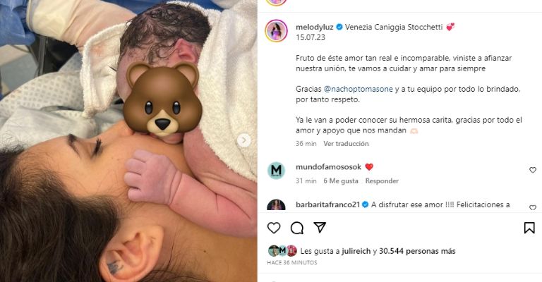A su vez, Melody Luz decidió compartir un posteo a sus redes sociales, con algunas postales del momento especial que vivieron este sábado. Junto al nombre de su hija, confirmaron que nació el sábado 15 de julio.