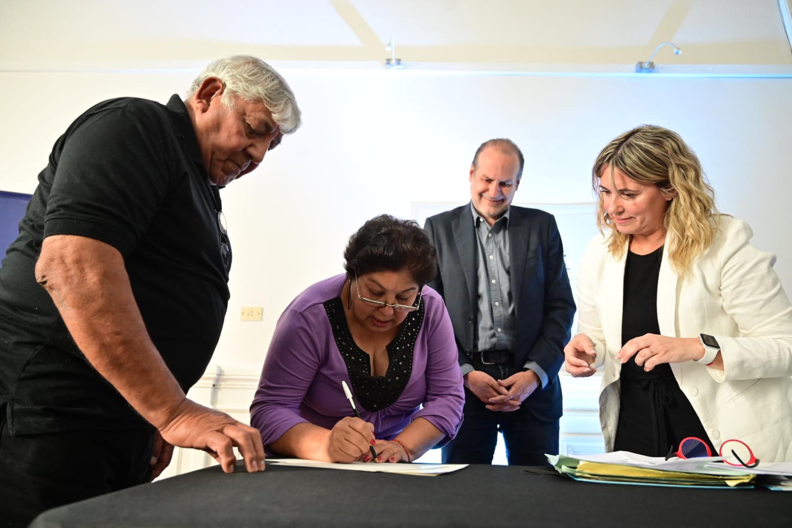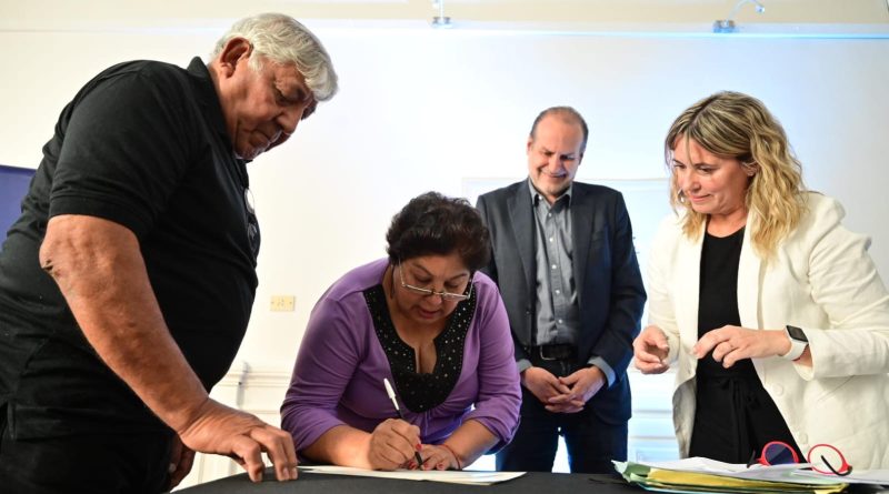 El jefe comunal estuvo acompañado por Silvana Vargas, directora de la Escribanía General de Gobierno, y Estela Cordero, escribana delegada de la citada cartera provincial bonaerense.