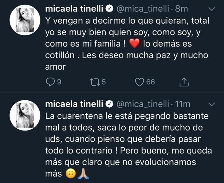 Micaela, su hija mayor, quiso ayudarlo y realizó fuerte declaraciones en Twitter: “La cuarentena le está pegando bastante mal a todos, saca lo peor de muchos de ustedes, cuando pienso que debería pasar todo lo contrario! Pero bueno, me queda más que claro que no evolucionamos más“.