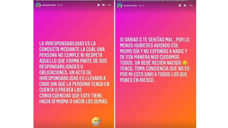 En la siguiente historia, Mica fue aún más directa. Sin embargo, no mencionó a la exesposa de su actual pareja y padre de su hijo Luca: “Si sabías que te sentías mal, por lo menos hubieses avisado ese mismo día y no exponías a nadie y de esa manera nos cuidamos todos“. Y continuó: “Un bebé recién nacido tengo. Tomá conciencia que no es por mí esto, sino a todos los que ponés en riesgo“, sentenció furiosa la pareja de Fabián Poroto Cubero. (Exitoina)