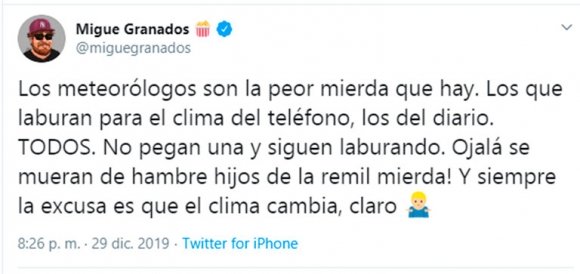 Los meteorólogos son la peor mierda que hay. Los que laburan para el clima del teléfono, los del diario. Todos. No pegan una y siguen laburando. ¡Ojalá se mueran de hambre, hijos de la re mil mierda! Y siempre la excusa es que el clima cambia, claro”, twitteó el actor y conductor, generando una gran polémica en la red social.