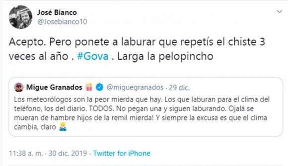 José Bianco, pronosticador del clima de TN, no dudó en salir a responderle con mucha ironía:“Acepto. Pero ponete a laburar que repetís el chiste 3 veces al año. Largá la pelopincho”.