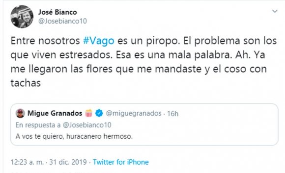 Sin embargo, Migue bajó los decibeles del tema cuando le respondió con humor a Bianco: “A vos te quiero, huracanero hermoso”. Y José le retrucó con humor: “Entre nosotros #Vago es un piropo. El problema son los que viven estresados. Esa es una mala palabra. Ah. Ya me llegaron las flores que me mandaste y el coso con tachas”.