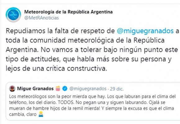 Pero mientras Bianco terminó poniéndole gracia a la polémica, otros especialistas se tomaron muy mal las palabras de Granados. Por ejemplo, desde la cuenta de Meteorología de la República Argentina expresaron:“Repudiamos la falta de respeto de Migue Granados a toda la comunidad meteorológica de la República Argentina. No vamos a tolerar bajo ningún punto este tipo de actitudes, que habla más sobre su persona y lejos de una crítica constructiva”.
