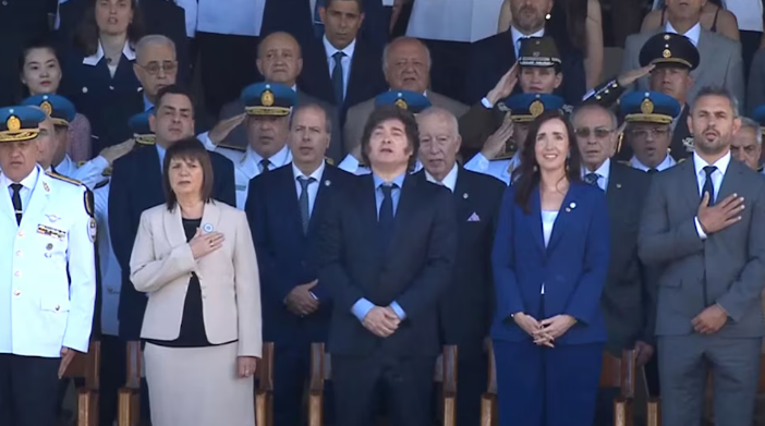 En la plana principal del escenario se ubicó Milei y, a su lado, Villarruel. A la derecha del Presidente se dispuso la ministra de Seguridad, Patricia Bullrich; y, pegados a la vice, el titular de Diputados, Martín Menem, y la secretaria general de la Presidencia, Karina Milei, quien tiene una pésima relación con la jefa del Senado.