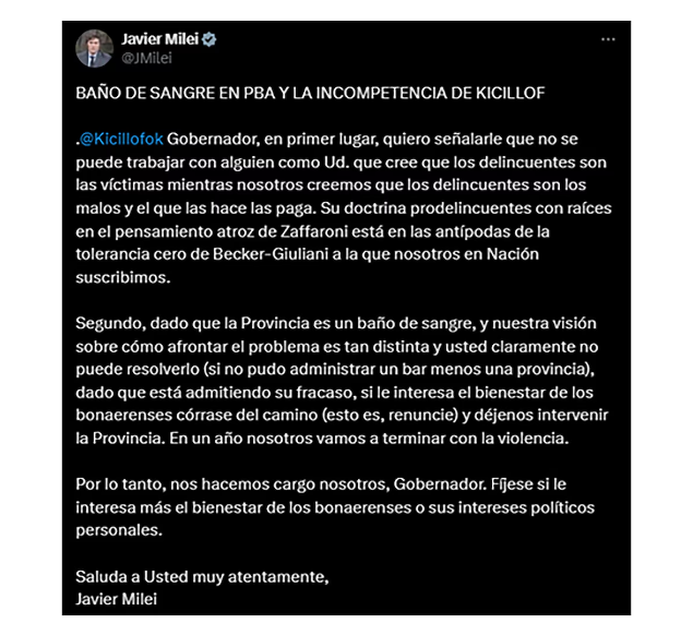 El presidente Javier Milei se refirió hoy a los hechos de inseguridad en la provincia de Buenos Aires, y pidió la renuncia del gobernador Axel Kicillof.