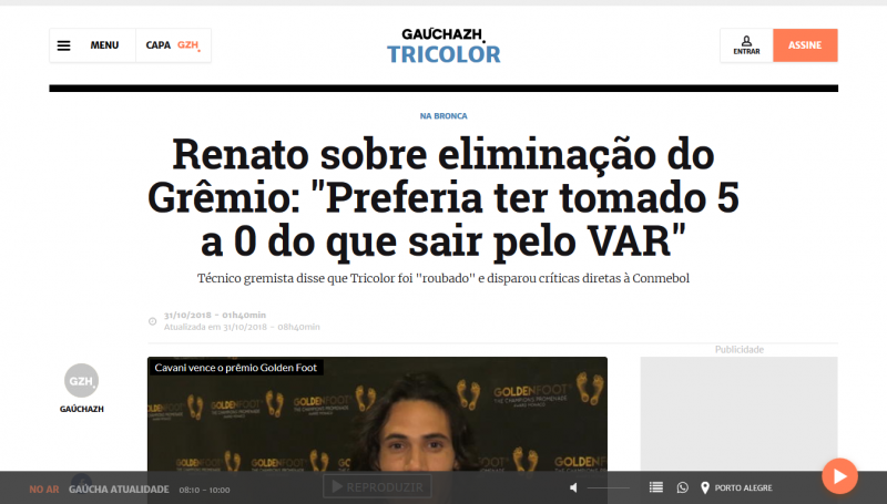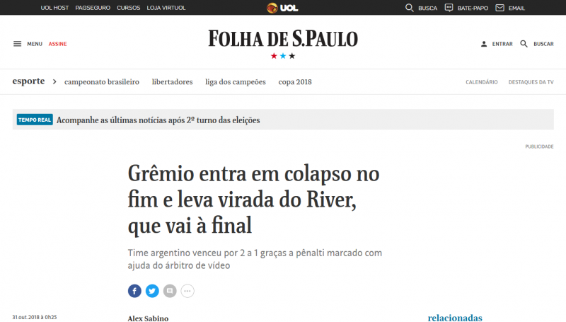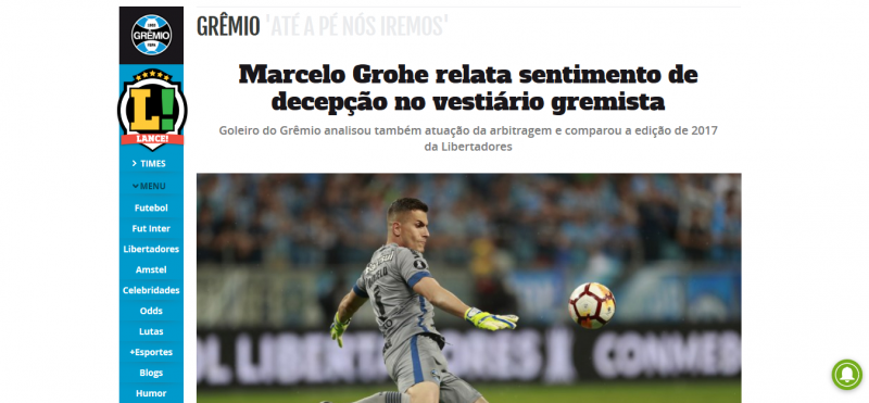 La prensa brasileña lamentó hoy la eliminación de Gremio en la semifinal de la Copa Libertadores, al caer como local ante River, resaltando que el equipo de Porto Alegre perdió un partido que estaba ganando y que el penal que le dio el triunfo a los “Millonarios” fue sancionado tras consultar con el VAR.