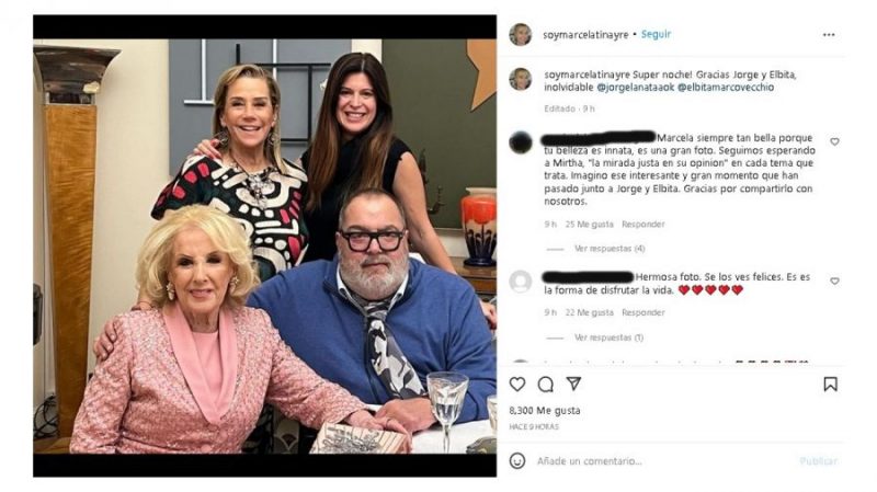 La velada fue el viernes por la noche en la casa del conductor de PPT. La diva fue acompañada por su hija que subió una foto del encuentro a su cuenta de Instagram. “Súper noche. Gracias Jorge y Elbita, inolvidable”, expresó Marcela visiblemente contenta.