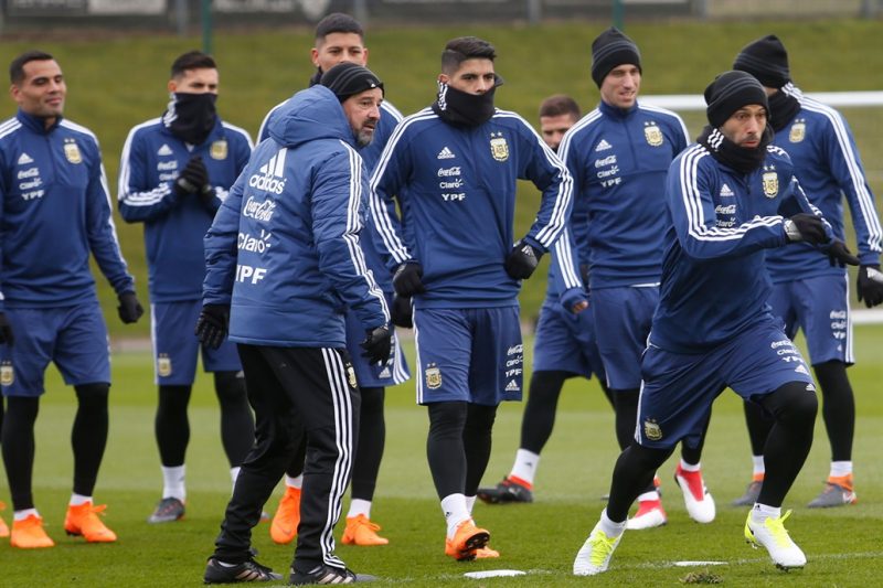 Gorros, calzas, cuellos térmicos, guantes. Cualquier elemento es bienvenido para cubrirse del frío, tanto que cuesta descubrir a cada futbolista de la selección argentina en el entrenamiento matutino, mientras el cielo se cierra y los cuatro grados de temperatura congelan el aire. No está tan mal, igual: en la madrugada el termómetro se había estacionado en cero, una marca que se espera vuelva durante la semana. Para calentarlos, el profesor Jorge Desio los apura en el comienzo de la mañana. “¡Robala, sparring, dale!”, “¡Buena, buena, buena!”, “¡Bien, Javier, así!”, “¡Precisión en el pase, Leo!”. Javier es Mascherano y Leo es en realidad Leandro Paredes y no Messi, al que se lo espera a la tarde.