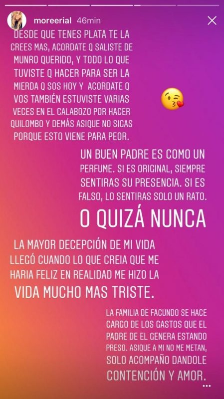 “Yo estoy para acompañar a mi novio en la situación que está viviendo. Lamentablemente mi padre no para de chantajear y extorsionar a la gente. Para cosas importantes que lo necesité no estaba, pero para extorsionar y generar miedo sí aparece rápido“, disparó la joven.