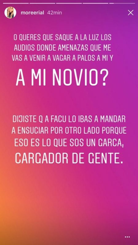 Por último, Morena acusó a su papá de enviarle violentos audios de Whatsapp: “¿Querés que saque a la luz los audios donde me amenazás que me vas a venir a cagar a palos a mi y a mi novio? Dijiste que a Facu lo ibas a mandar a ensuciar por otro lado porque eso es lo que sos un garca, un cagador de gente“. (Diario Show)
