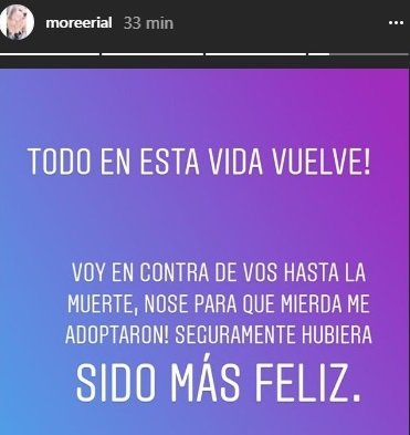 “Todo en esta vida vuelve. Voy en contra de vos hasta la muerte, ¡no sé para qué mierda me adoptaron! Seguramente hubiera sido más feliz”, lanzó More muy enojada en sus historias de Instagram.