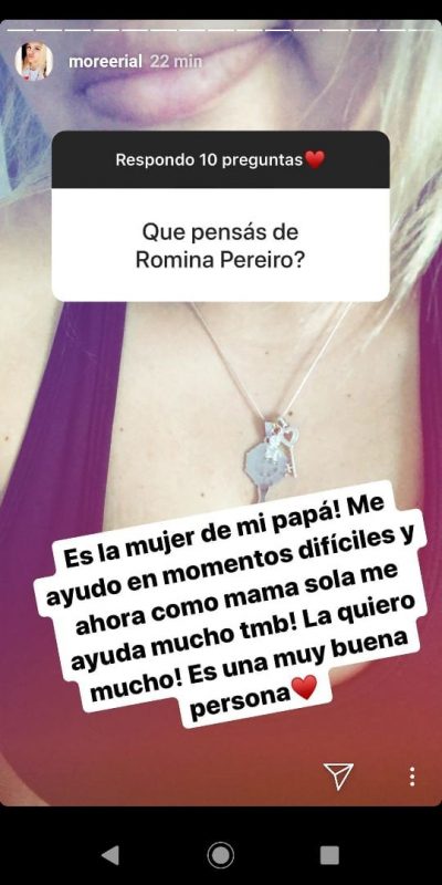 Además, Morena habló sobre Romina Pereiro y tuvo palabras muy hermosas. “¡Es la mujer de mi papá! Me ayudó en momentos difíciles y ahora como mamá sola también me ayuda mucho. ¡La quiero mucho! Es muy buena persona“, aclaró Rial.