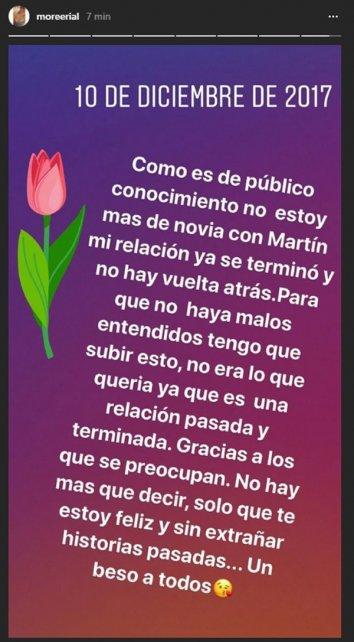 “Como es de público conocimiento, no estoy más de novia con Martín, mi relación se terminó y no hay vuelta atrás. Para que no haya malos entendidos tengo que subir esto, no es lo que quería ya que es una relación pasada y terminada. Gracias a los que se preocupan. No hay más que decir, solo que estoy feliz y sin extrañar historias pasadas”.