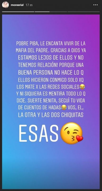 Lejos de quedarse callada, Morena disparó a través de Instagram Stories: “Pobre piba, le encanta vivir de la mafia del padre. Gracias a Dios ya estamos lejos de ellos y no tenemos relación. Porque una buena persona no hace lo que ellos hicieron conmigo sólo porque los maté por las redes sociales“.