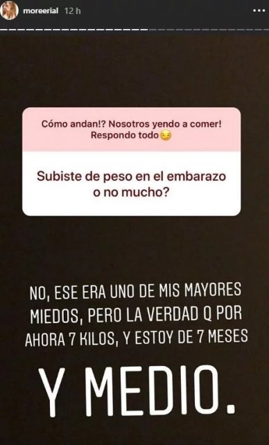 “No subí mucho, ese era uno de mis mayores miedos, pero la verdad que por ahora siete kilos, y estoy de siete meses y medio”, indicó Morena.