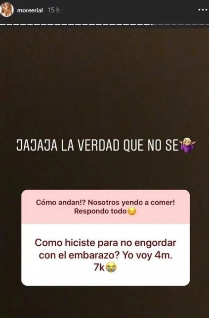 Luego, una mujer le consultó cuál fue su método. “¿Cómo hiciste para no engordar con el embarazo? Yo voy cuatro meses y engordé siete kilos”, quiso saber. “Jajaja, la verdad que no sé”, respondió Morena.