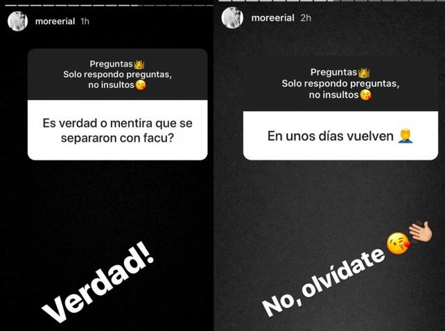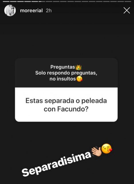 “En unos días vuelven”, le comentó uno de sus seguidores, acostumbrados a las muchas idas y vueltas que tuvo la pareja que fueron padres de Facundo Benicio el 27 de marzo. Pero Morena fue contundente y respondió: “No, olvidate“.