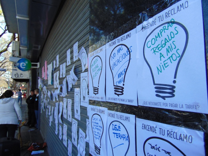 En el marco de las medidas de acción de los movimientos sociales que se lleva a cabo en todo el país, este miércoles se realizó una intervención artística en la puerta de la sede de Edenor de la localidad de Olivos “contra el ajuste y los tarifazos” bajo la consigna “Encendé tu reclamo”.