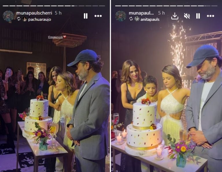 Finalmente, la adolescente también publicó cortos clips donde se la observó soplando velitas en la torta de dos pisos junto a sus padres y su hermano en el centro del salón ante la atenta mirada de todos los amigos y familiares que se acercaron al salón para celebrar los 15 años de Muna en una fiesta a la que no le faltó nada.