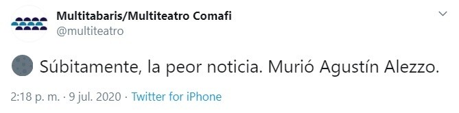 La triste noticia de su muerte la anunció Carlos Rottemberg en Twitter: “Súbitamente, la peor noticia. Murió Agustín Alezzo”.