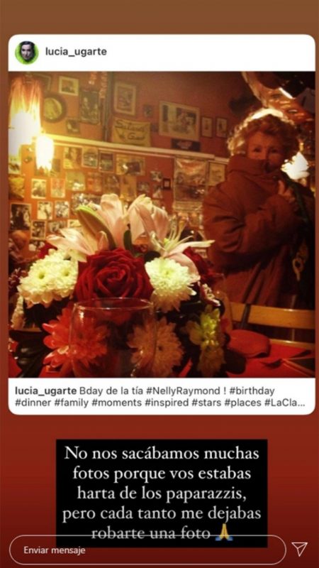 Que descanses en paz Tía Nelly Raymond. Gracias por contagiarme tu fuerza, glamour, por inspirarme, por hacerme reina de belleza… nunca me voy a olvidar el año nuevo que pasamos solas en tu piso sobre la 9 de Julio brindando champagne y riéndonos de la vida“, manifestó Ugarte en su cuenta de Twitter.