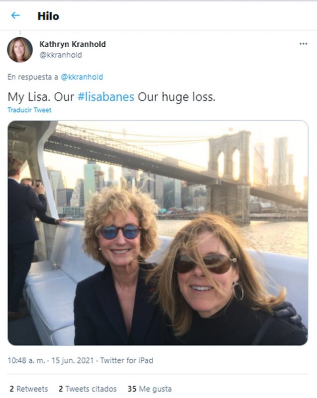 Kathryn Kranhold, la esposa de la actriz, tuiteó el martes una serie de fotos para despedirla y rendirle homenaje. “Amor y luz”, describió en una de las postales. Mientras que en otra puso: “Mi Lisa, nuestra Lisa Banes. Nuestra gran pérdida”.