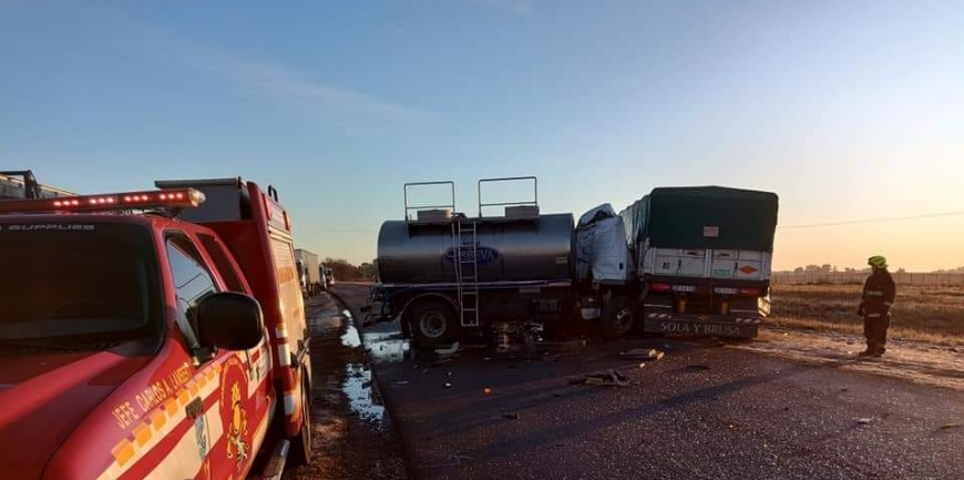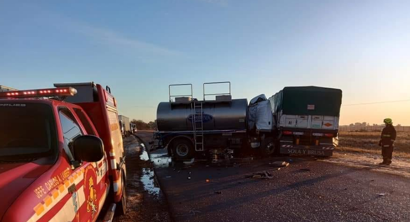 Según publicó el portal FM Radiante, un transporte de leche que iba de Trenque Lauquen a 30 de Agosto se cruzó de carril y chocó de lleno a un camión cerealero que circulaba de 30 de Agosto a Trenque Lauquen.