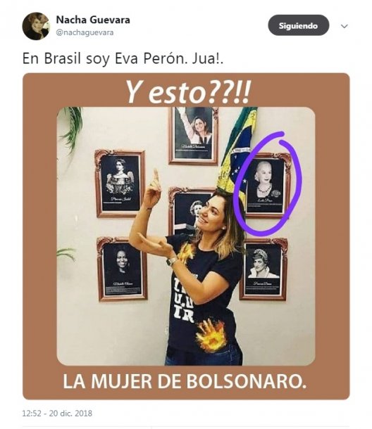 “En Brasil soy Eva Perón. Jua!”, respondió Nacha en su Twitter tomándose la situación con mucho humor, mientras que varios ciudadanos brasileros le pidieron disculpas por “la ignorancia” de la mujer de Bolsonaro y por llenaron la publicación de memes demostrando incredulidad ante el error.