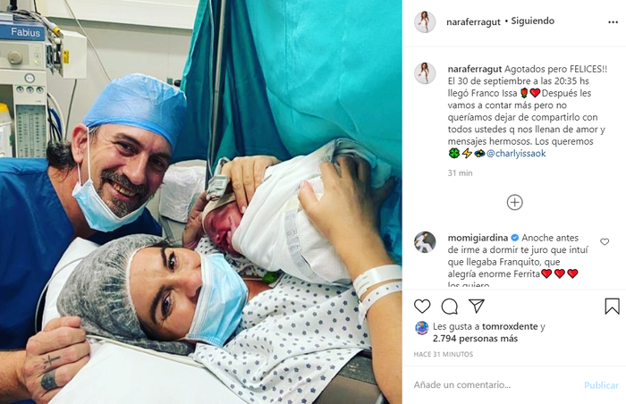 “Agotados pero FELICES!! El 30 de septiembre a las 20:35 hs llegó Franco Issa 🌹❤️Después les vamos a contar más pero no queríamos dejar de compartirlo con todos ustedes q nos llenan de amor y mensajes hermosos. Los queremos 🍀⚡️💫@charlyissaok“, fue la frase que posteó la periodista del Nueve.