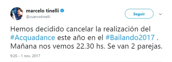 El pasado 1° de noviembre, el conductor Marcelo Tinelli informó desde su cuenta oficial de Twitter: “Hemos decidido cancelar la realización del #Acquadance este año en el Bailando 2017”.