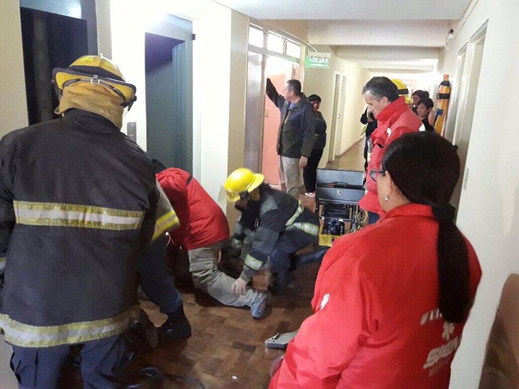 El jefe de bombero Hugo Millapán contó que el hombre estaba sobre el techo del elevador cuando éste se accionó, dejando sus piernas presionadas contra el piso del edificio.