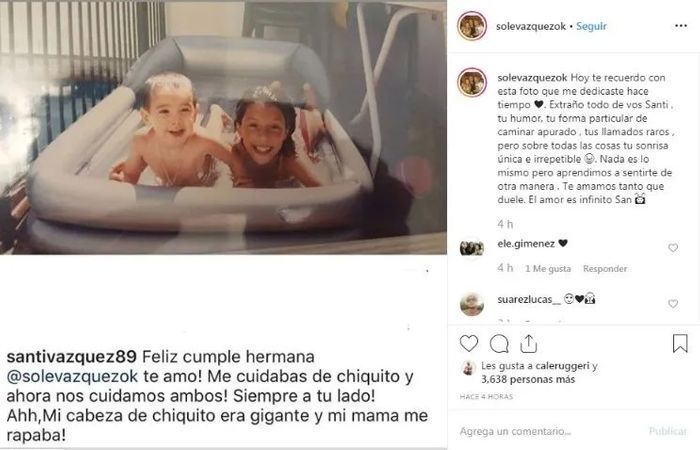 Por su parte, su hermana Soledad, también le dedicó un tierno mensaje. “Hoy te recuerdo con esta foto que me dedicaste hace tiempo ❤️. Extraño todo de vos Santi, tu humor, tu forma particular de caminar apurado, tus llamados raros, pero sobre todas las cosas tu sonrisa única e irrepetible ��. Nada es lo mismo pero aprendimos a sentirte de otra manera. Te amamos tanto que duele. El amor es infinito San ��“.