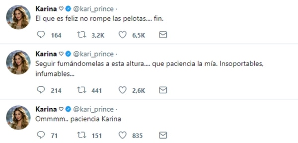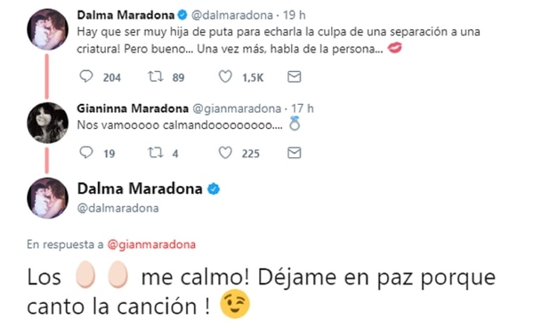 “Hay que ser muy hija de puta para echarle la culpa de una separación a una criatura. Pero bueno… Una vez más, habla de la persona…”, escribió Dalma Maradona en su cuenta de Twitter manifestando su furia contra quien responsabilizó a su sobrino Benjamín Agüero –hijo de Gianinna Maradona y Sergio Kun Agüero– de la separación del futbolista y Karina La Princesita Tejeda.