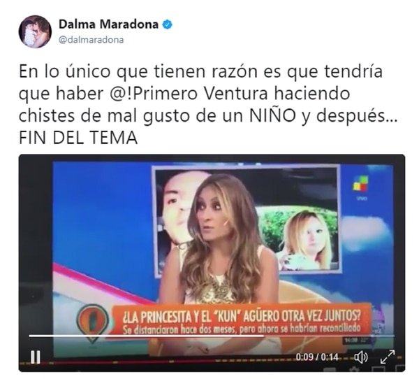 “En lo único que tienen razón es que tendría que haber @ (arrobado). Primero Ventura haciendo chistes de mal gusto de un NIÑO y después… Fin del tema”, aseguró Dalma. (Infobae)