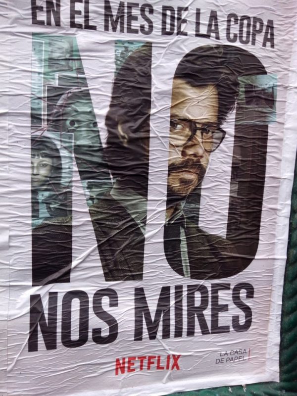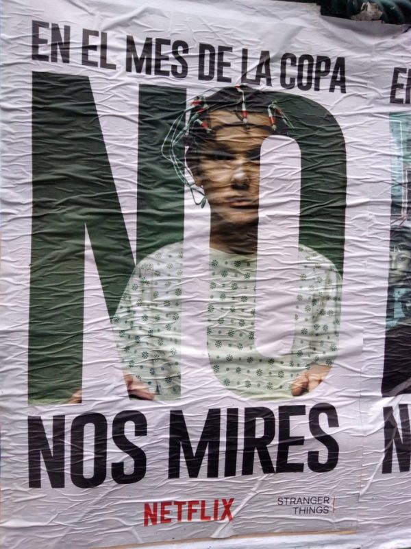También volvió a empapelar al ciudad, con la leyenda: “En el mes de la Copa no nos mires”. Allí sí aclaró que el mensaje es de la propia compañía. Y publicitó algunas de sus series emblemáticas.