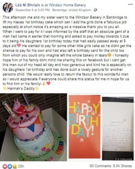 La madre de la niña, Lea Ni Bhriain, compartió lo sucedido en su cuenta de Facebook y la conmovedora historia se volvió viral a tal punto que ya llegó a las 20 mil reacciones. En la publicación indica: “Cuando fui a pagarlo, el personal me informó que un caballero había venido más temprano y preguntó si podía pagar la torta porque ese día hubiese cumplido un año su hija, a quien nunca tuvo la chance de regalarle una”.